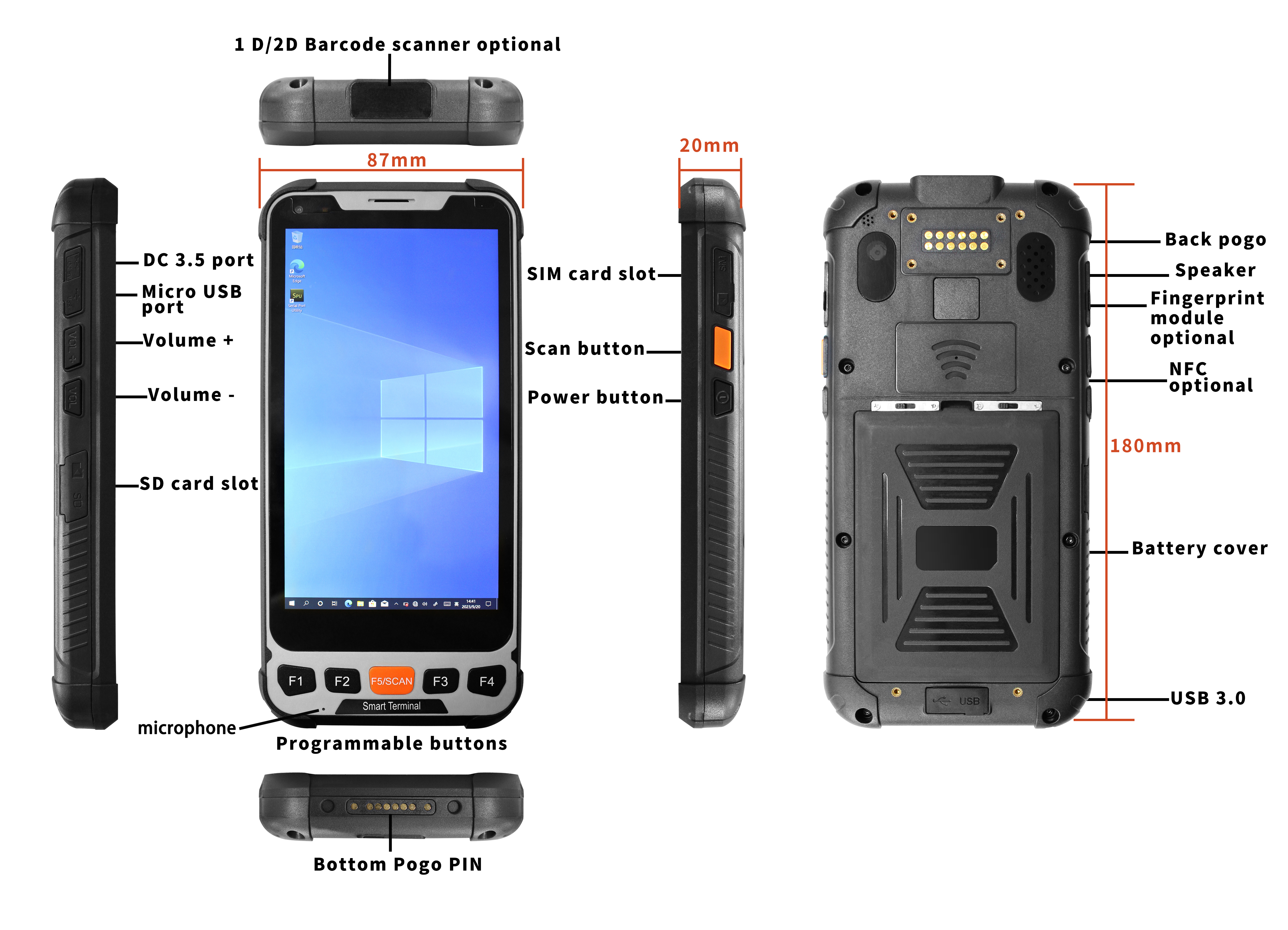 SH5-W是一款5.5英寸坚固耐用的手持终端,由英特尔Cherry Trail Z8350四核处理器(1.44GHz,涡轮高达1.92GHz)供电,运行Windows 10 Pro(家庭/物联网可选)。它具有4GB/64GB存储、5.5英寸1080×1920 IPS显示屏(400nits)、2MP前置/5MP后置摄像头、5000mAh 3.8V电池(19.0Wh)、4G LTE连接(EG91-EX/NAX模块)、英特尔WiFi 6 3165和蓝牙4.2。它具有IP65防尘/防水、1.2m跌落、可选UHF RFID(5M范围)和指纹传感器
