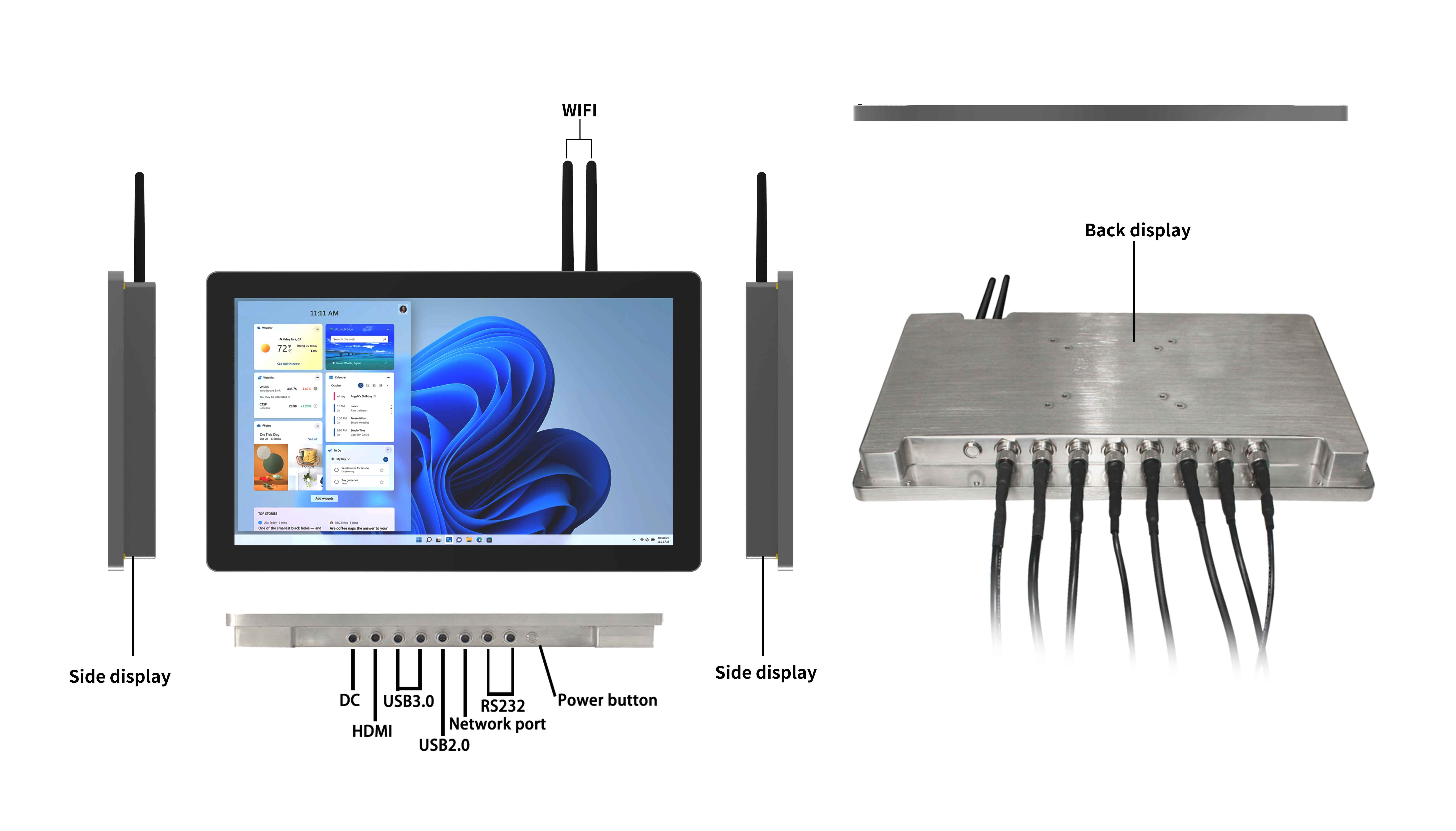 DC-IN 电源接口 ×1;HDMI 接口 ×1;USB3.0 接口 ×2;USB2.0 接口 ×1;网口 ×1;RS232 串口 ×2(标准 DB9 接头) 航插接口形式 |