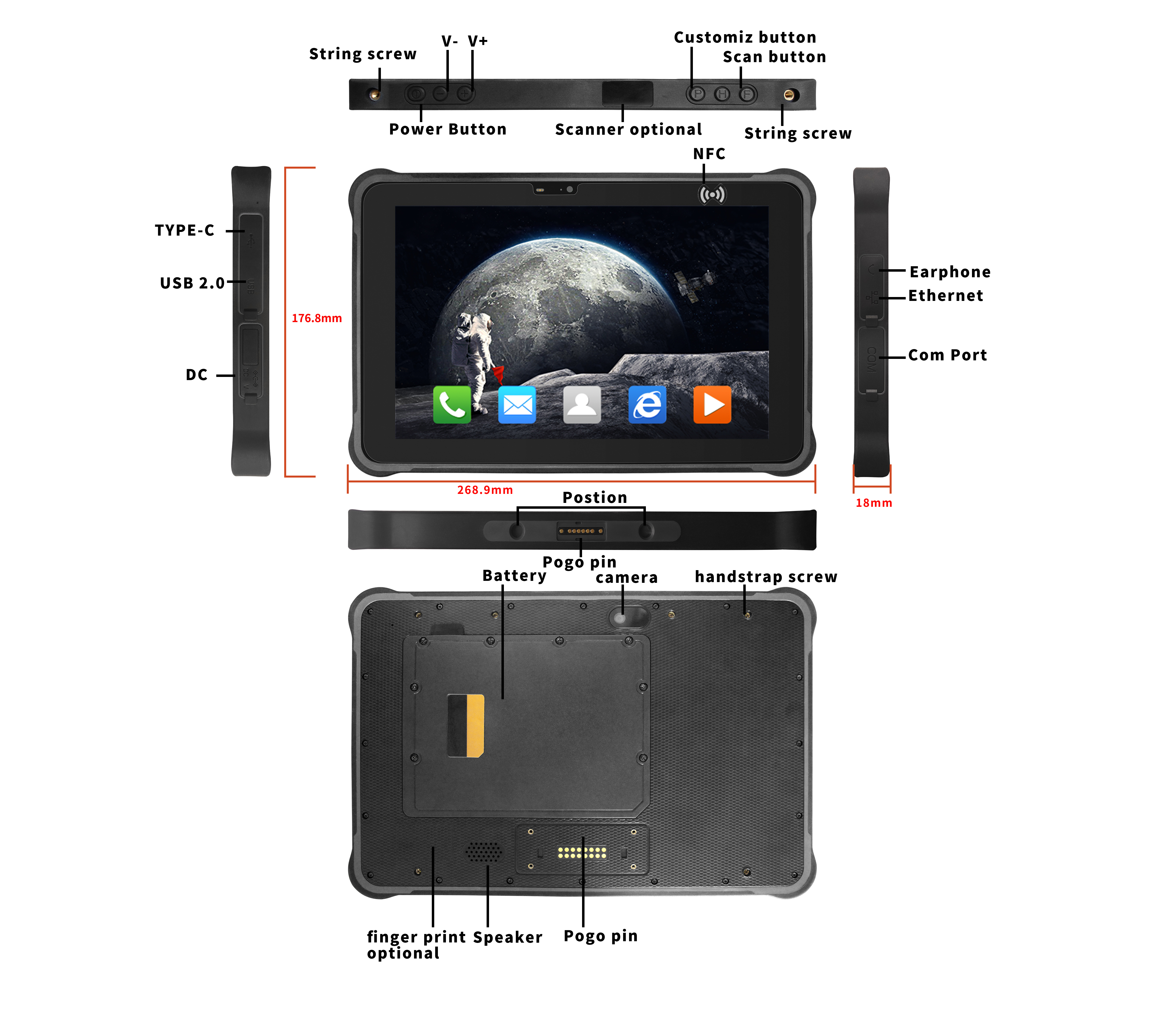 Type-C×1(支持OTG);SIM卡槽×1;TF卡槽×1;耳机接口×1;直流电源接口×1(3.5×12毫米);USB 2.0×1;RJ45网口×1;RS232串口×1 底部pogopin接口:USB 2.0、充电、RS232 背部pogopin接口:USB 2.0、RS232 |