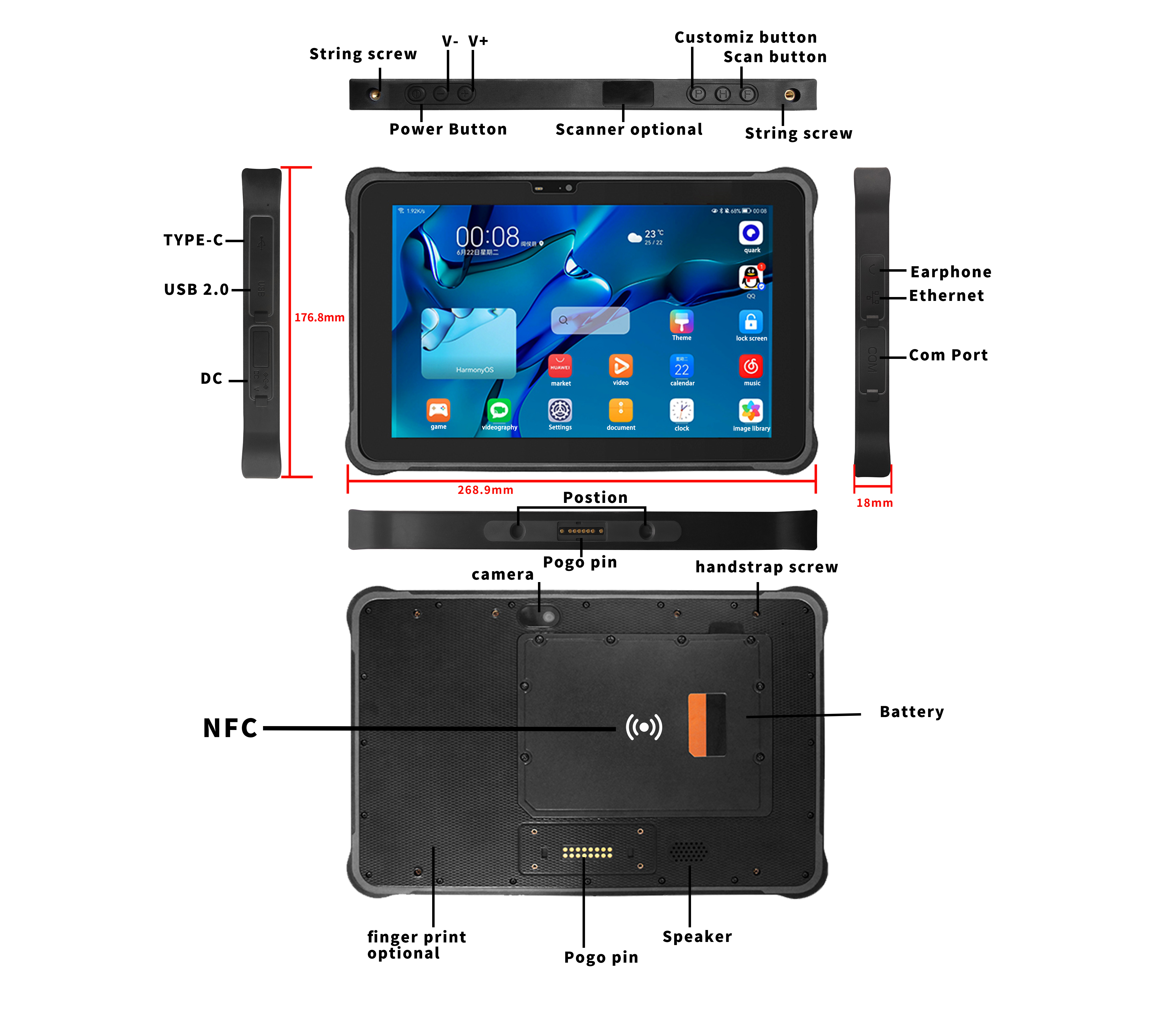 Type-C×1(支持OTG);SIM卡槽×1;TF卡槽×1;耳机接口×1;直流电源接口×1(3.5×12毫米);USB 2.0×1;RJ45网口×1;RS232串口×1 底部pogopin接口:USB 2.0、充电、RS232 背部pogopin接口:USB 2.0、RS232 EDP接口:预留接口 |