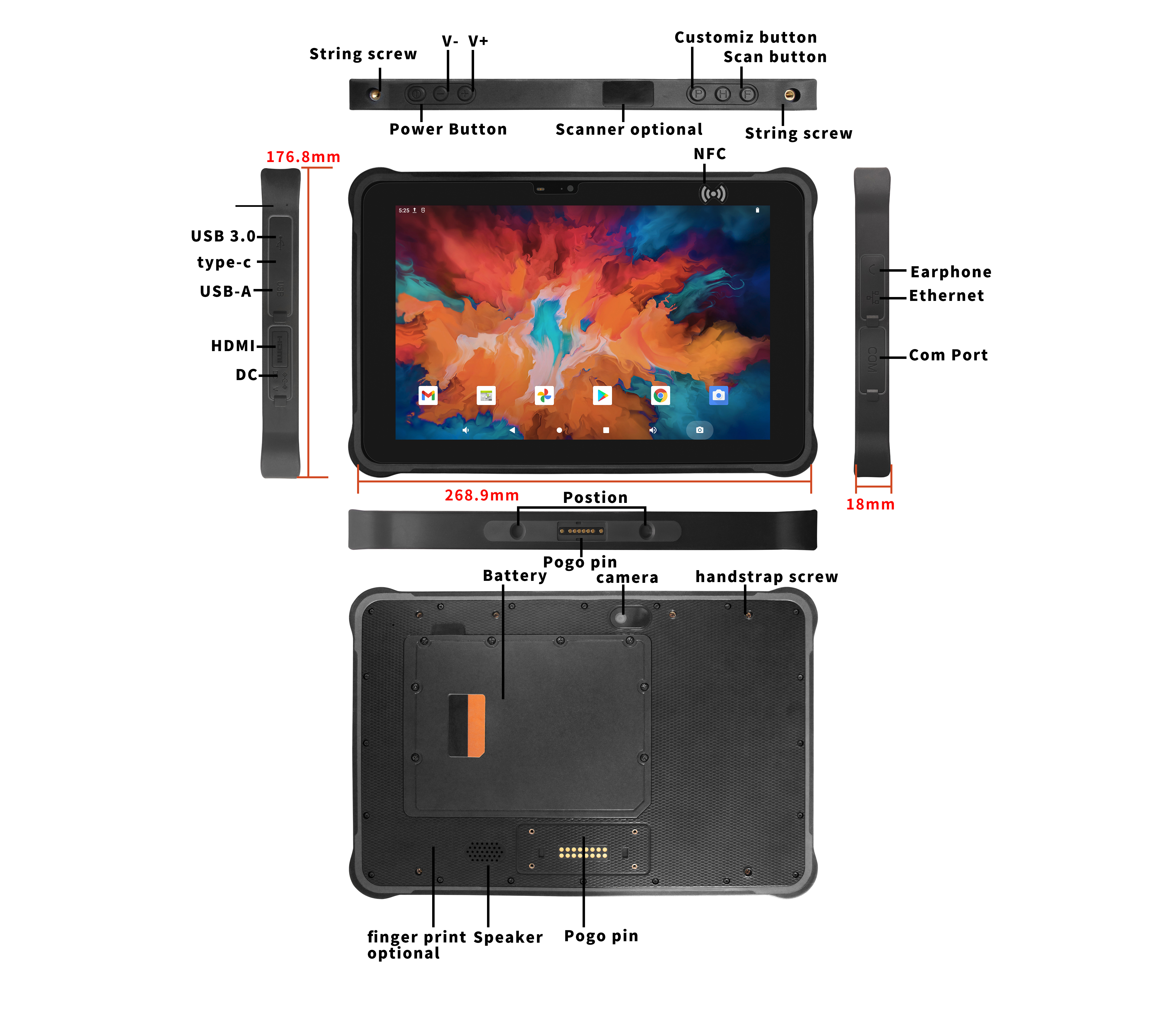 Type-C ×1(OTG);SIM卡槽×1;TF卡槽×1;耳机接口×1;直流电源接口×1(4.0×15毫米);USB-A:USB 2.0 ×1 + USB 3.0 ×1;RJ45网口×1;RS232串口×1;HDMI×1 底部pogopin:USB 2.0、充电、RS232 背部pogopin:USB 2.0、RS232 |