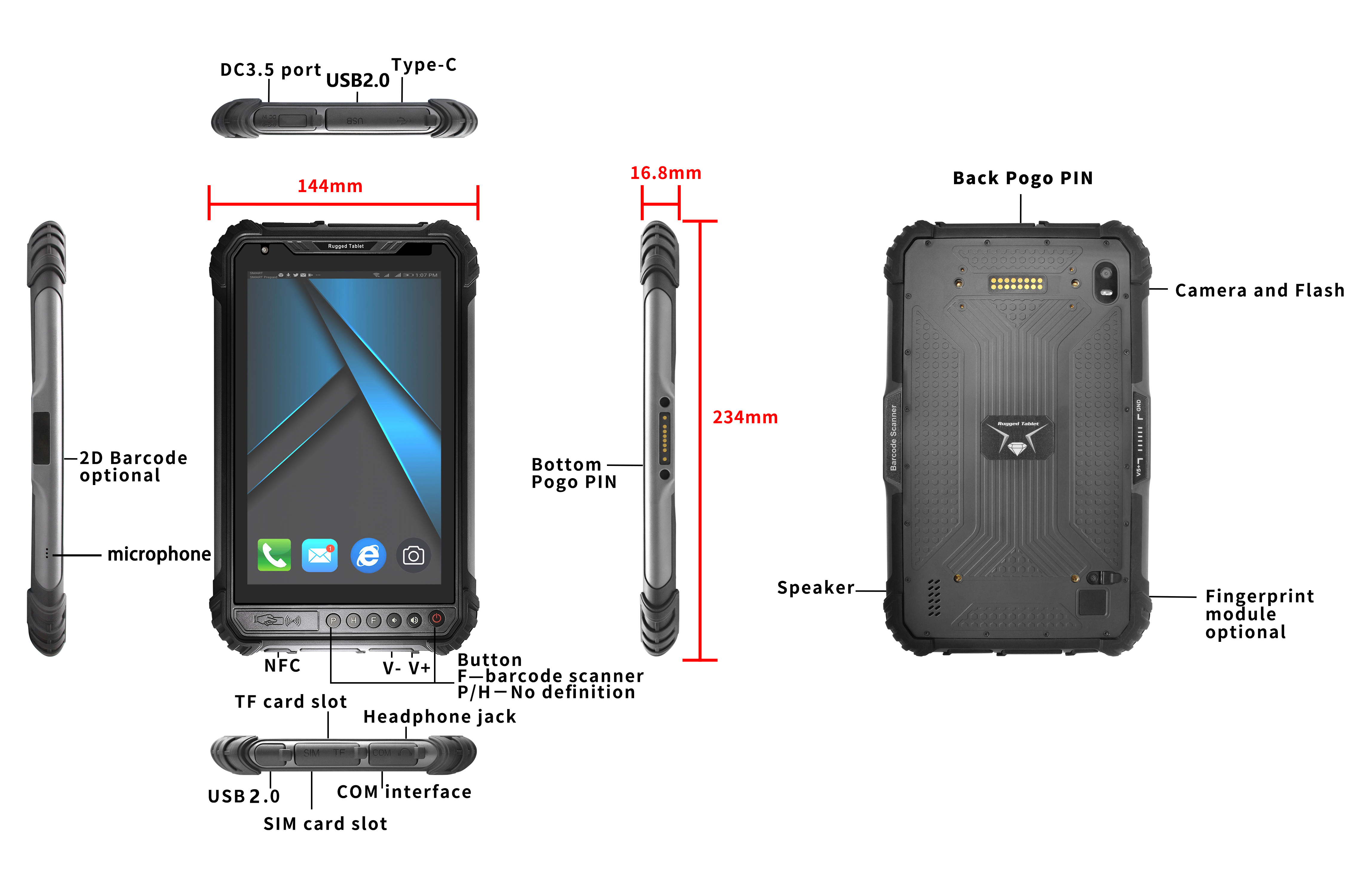 Type-C接口×1(支持OTG),SIM卡槽×1,TF卡槽×1,耳机接口×1,直流电源接口×1(3.5×15毫米),USB 2.0接口×2,RS232接口×1(迷你USB) 底部弹针接口:USB 2.0、充电、RS232 背部弹针接口:USB 2.0、RS232 |