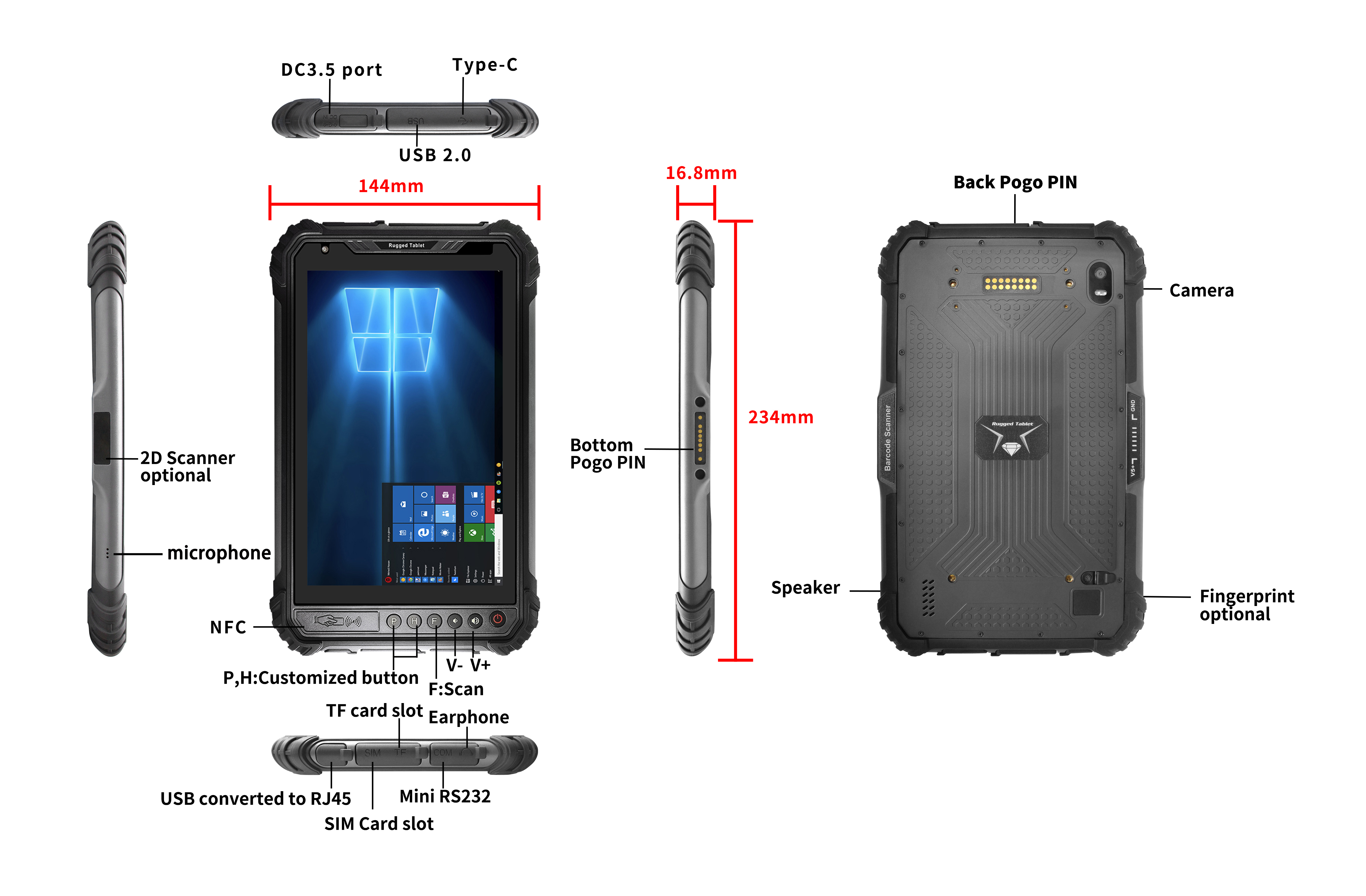 HDMI×1、SIM卡插槽×1、RS232×1(mini-USB接口)、耳机孔×1、DC电源孔×1(4.0×15mm)、USB 3.0×3 底部Pogopin:USB 2.0;充电;RS232 背部Pogopin:USB 2.0;RS232 |