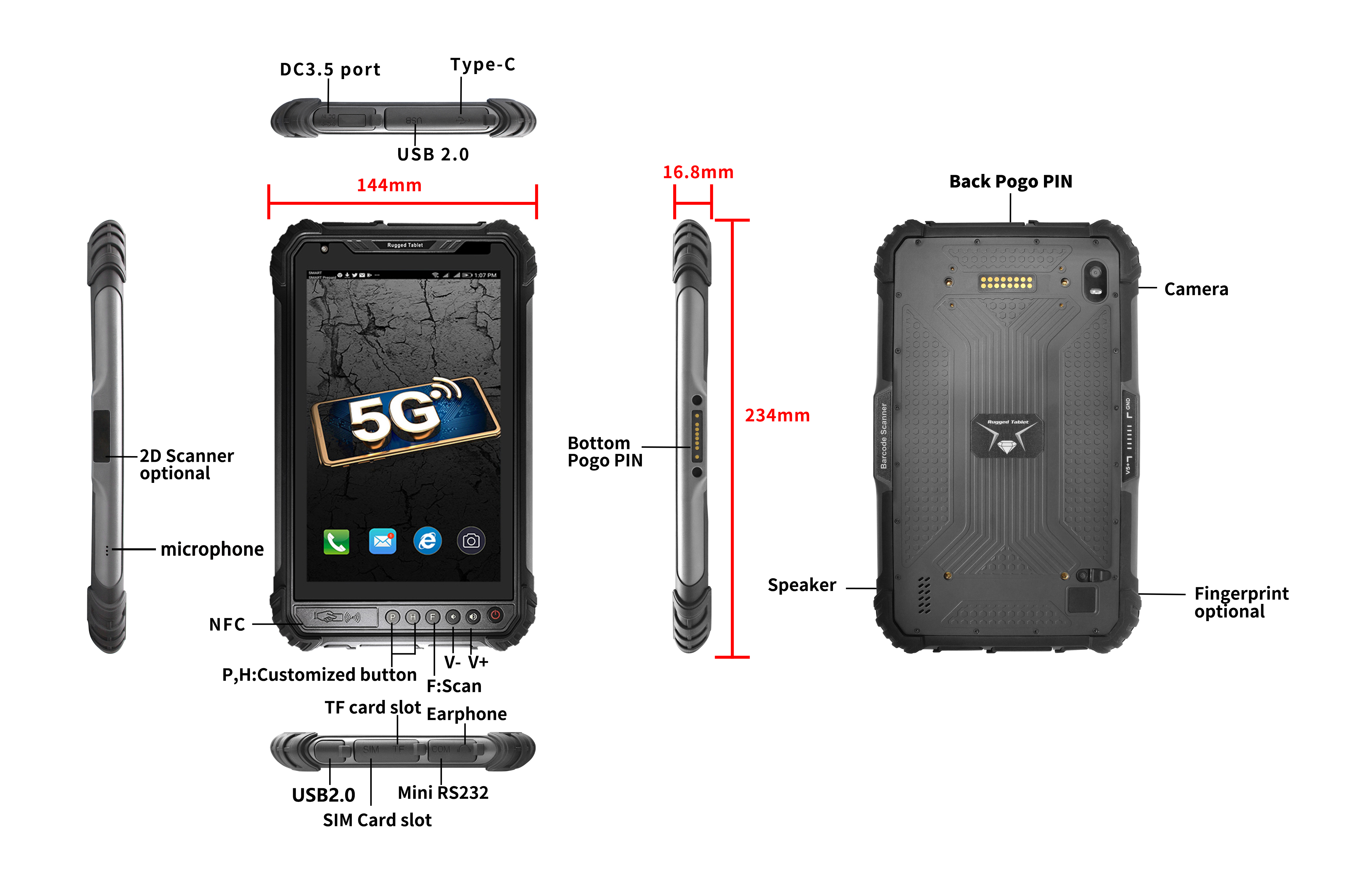 Type-C接口×1(支持OTG),SIM卡槽×1,TF卡槽×1,耳机接口×1,直流电源接口×1(3.5×15毫米),USB 2.0接口×2,RS232接口×1(迷你USB) 底部弹针接口:USB 2.0、充电、RS232 背部弹针接口:USB 2.0、RS232 |